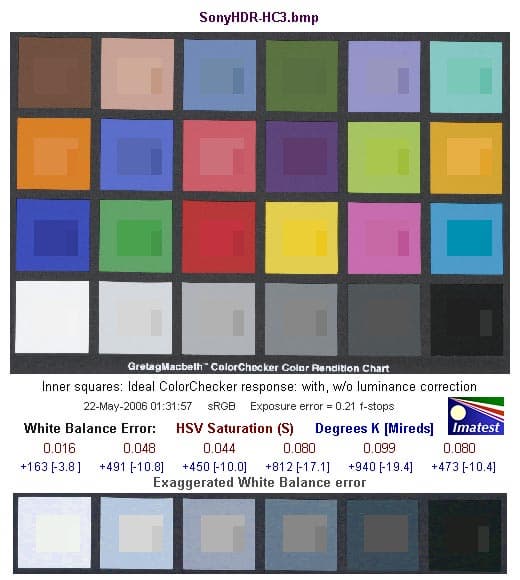 Средняя строчка цифр показывает нам численную оценку ошибки баланса белого в единицах цветового пространства HSV. Так, цифры красного цвета обозначают ошибку по координате S - saturation (насыщенность), цифры синего цвета в градусах Кельвина [Миредах (Mireds)]. При значении S < 0.02 (речь идет об ошибке по координате S в HSV), ошибка практически незаметна, а при ошибке S > 0.10 она видна, особенно на нейтральных полях большой яркости.