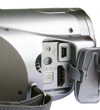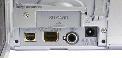 Карта памяти скрыта под отодвигающейся шторкой: пока ее не закроешь камера снимать не станет. Пластиковая заглушка на резиновой ножке скрывает композитный (A/V) и компонентный выходы, 1,5-миллиметровый разъем для подключения внешнего микрофона, и, наконец, вход питания. Субъективно: видеовыходы и вход питания расположены неудачно, ведь всякий раз приходится открывать экран, даже если в нет никакой нужды (например, при просмотре видео на телевизоре).