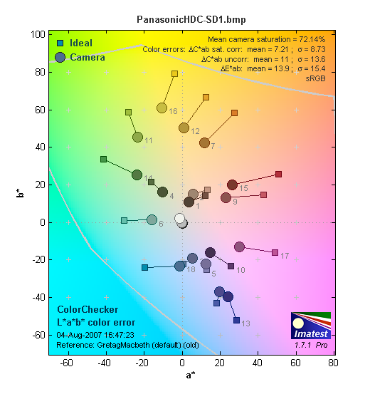 На последней диаграмме в графической форме представлены отклонения зарегистрированных камерой цветов от идеала в цветовом пространстве CIE LAB. Данная диаграмма отклонения в Lab отображает величину ошибки, которую допускает камера при передаче цвета.