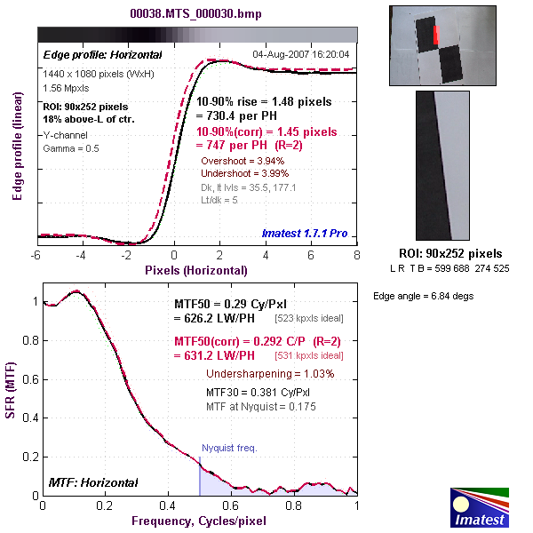 Верхний график представляет собой краевой профиль, для которого приведено значение 10-90% rise distance в пикселях, а нижний график представляет собой MTF (Modular Transfer Function — функция передачи модуляции), для которой приведен параметр MTF50 в циклах на пиксель. Краевой профиль и MTF камеры показаны черной линией. Красной пунктирной линией обозначен краевой профиль и MTF, которые программа Imatest считает близкими к оптимальным. 10-90% rise distance и MTF50 также являются расчетными величинами Imatest.
