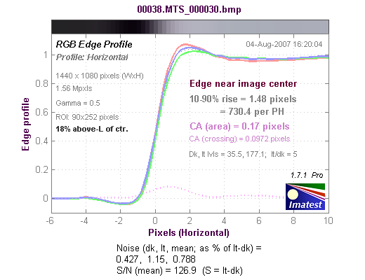 График хроматической аберрации (на самом деле, это тот же краевой профиль, только построенный по каждому цвету в отдельности). При значении параметра CA (area) равным 0-0.5 хроматическая аберрация не заметна.