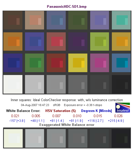 Средняя строчка цифр показывает нам численную оценку ошибки баланса белого в единицах цветового пространства HSV. Так, цифры красного цвета обозначают ошибку по координате S saturation (насыщенность), цифры синего цвета — в градусах Кельвина [Миредах (Mireds)]. При значении S < 0.02 (речь идет об ошибке по координате S в HSV), ошибка практически незаметна, а при ошибке S > 0.10 она видна, особенно на нейтральных полях большой яркости.