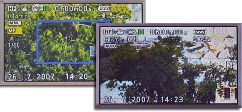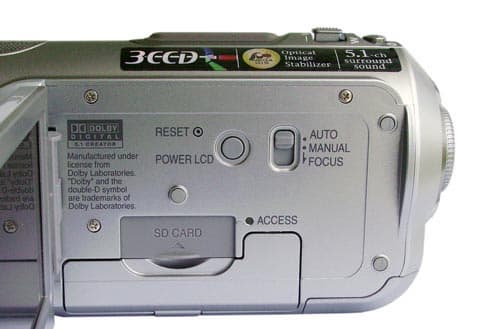 Под самим экраном негусто: пара кнопок и рычажок это все управление. Кнопка Reset аварийно перезагружает камеру (во время тестирования эта функция пригодилась, когда камера "зависла" после продолжительной безостановочной записи но это, к счастью, был единичный случай). Нажатие кнопки Power LCD усиливает яркость ЖК-экрана, повторное нажатие приводит яркость в норму (такая функция пригодится, если яркий солнечный свет мешает контролировать съемку). Наконец, трехпозиционный рычажок отвечает за выбор способа съемки (автоматический/ручной), а удержание рычажка в самом нижнем положении принудительно запускает автоматическую подстройку фокуса по объекту, находящемуся в центре кадра.