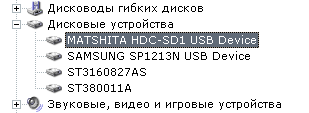 С компьютером видеокамера соединяется по интерфейсу USB 2.0 с помощью mini USB кабеля, и определяется в системе как дисковое устройство MATSHITA HDC-SD1.