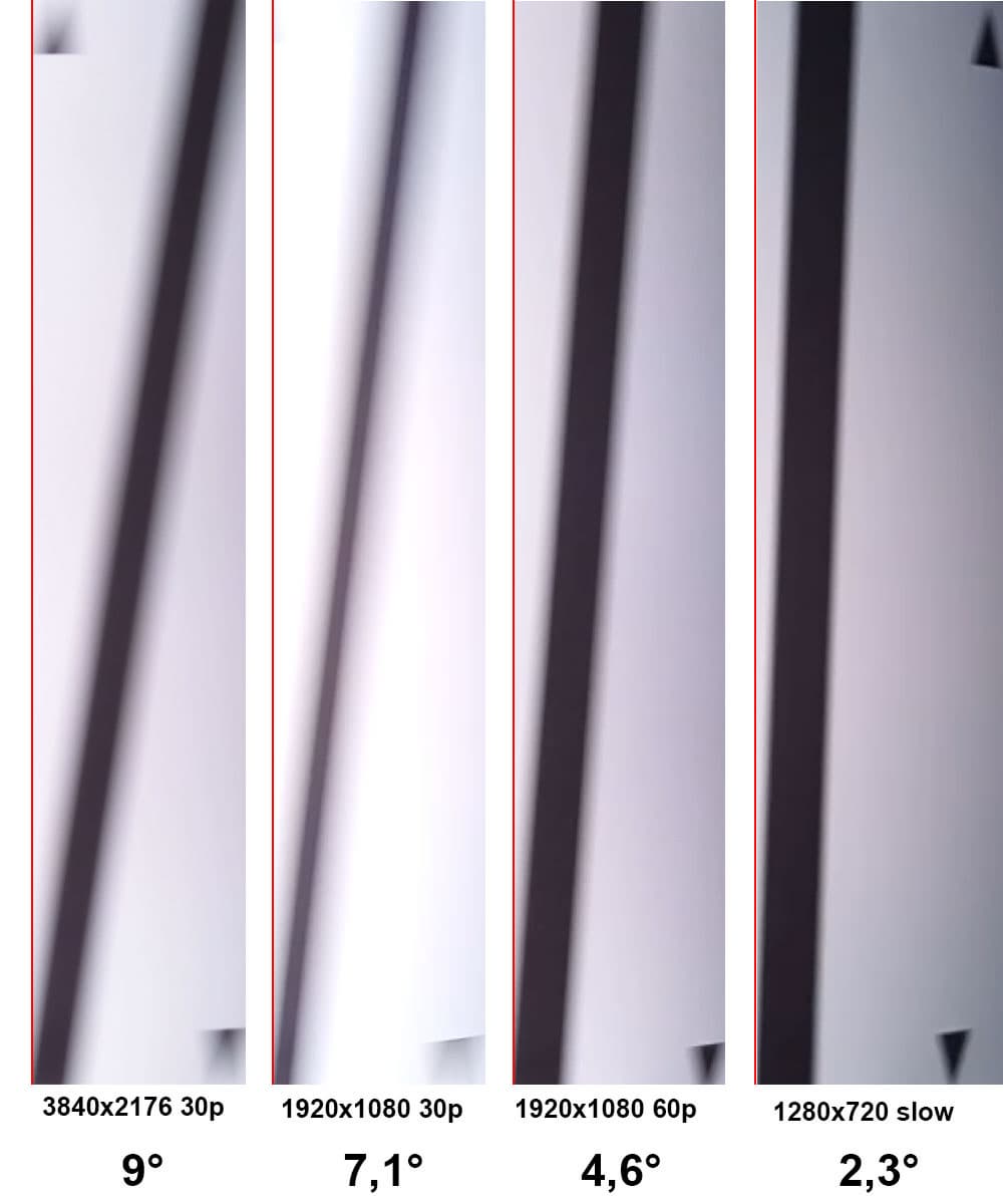 Полученные результаты в 9° при съемке в 4K и 7,1 в Full HD можно назвать очень высокими (например, 5,8° — это неплохой результат для современного фотоаппарата, а видеокамеры дают еще меньший наклон вертикалей). Следует ожидать, что второе проявление роллинг-шаттера при съемке камерой нашего смартфона — желеобразность картинки — также окажется неприемлемо высоким.