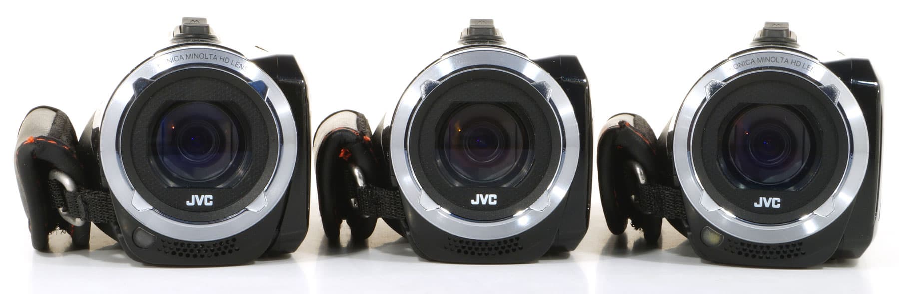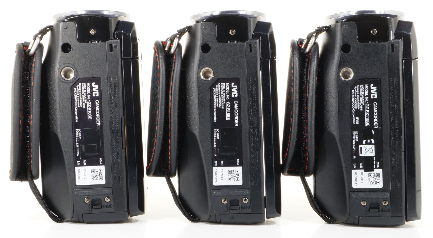 Взглянув на аппараты спереди, можно заметить уже более явные отличия: в модели JVC GZ-R15 (средняя на снимке) отсутствует фонарь подсветки, который имеется в остальных двух моделях, и расположен под объективом, сбоку от вынесенной вперед микрофонной решетки. Этот яркий светодиод, обладая эффективностью в несколько метров, может включаться как вручную, так и автоматически при падении уровня освещенности (способ активации подсветки регулируется в служебном меню).