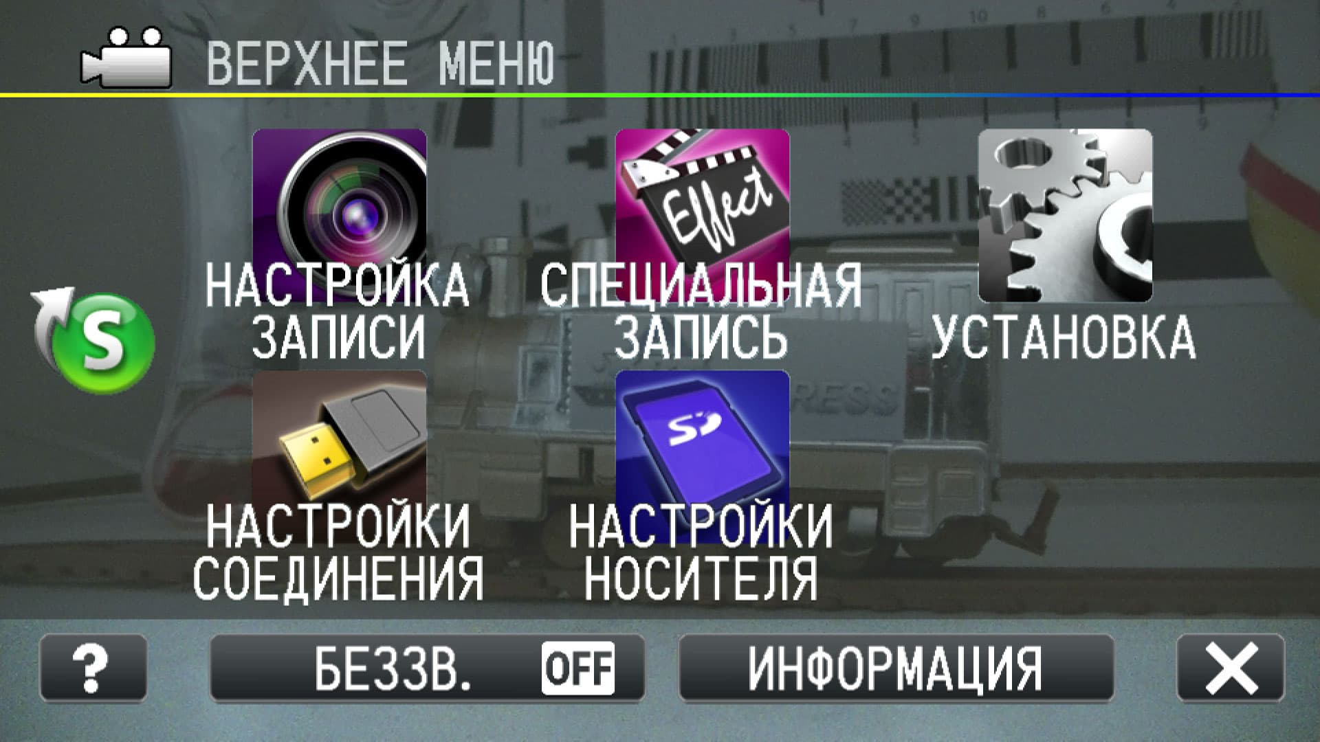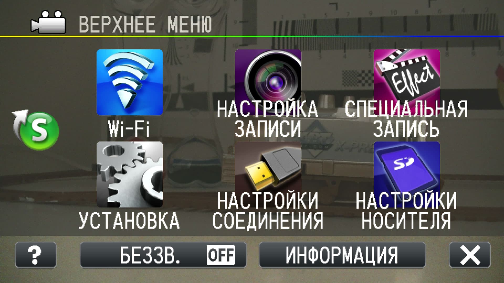 В рабочем режиме на дисплей камеры выводится служебная информация о текущем состоянии аппарата, а также чувствительные к нажатию иконки-пиктограммы, несущие ту или иную функцию: переключение режимов работы, управление зумом, создание фотоснимка, старт/стоп видеозаписи, вызов служебного меню. Жаль, но такие необходимые вещи, как экранная сетка, зебра или гистограмма, на экран не выведешь — они отсутствуют в камере. Ну что поделаешь — любительский аппарат, ничего «лишнего».