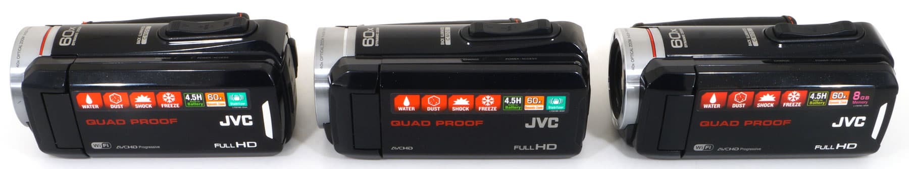 Данный обзор необычен тем, что в нем будут изучены сразу три аппарата. Такая «экономия» объясняется очень просто: эти три модели почти неотличимы друг от друга (по крайней мере, внешне), а по размерам и весу являются полными близнецами. Главное же свойство, объединяющее всю линейку JVC 2014 года — наличие защиты от четырех стихий: воды, пыли, ударов и низких температур.
