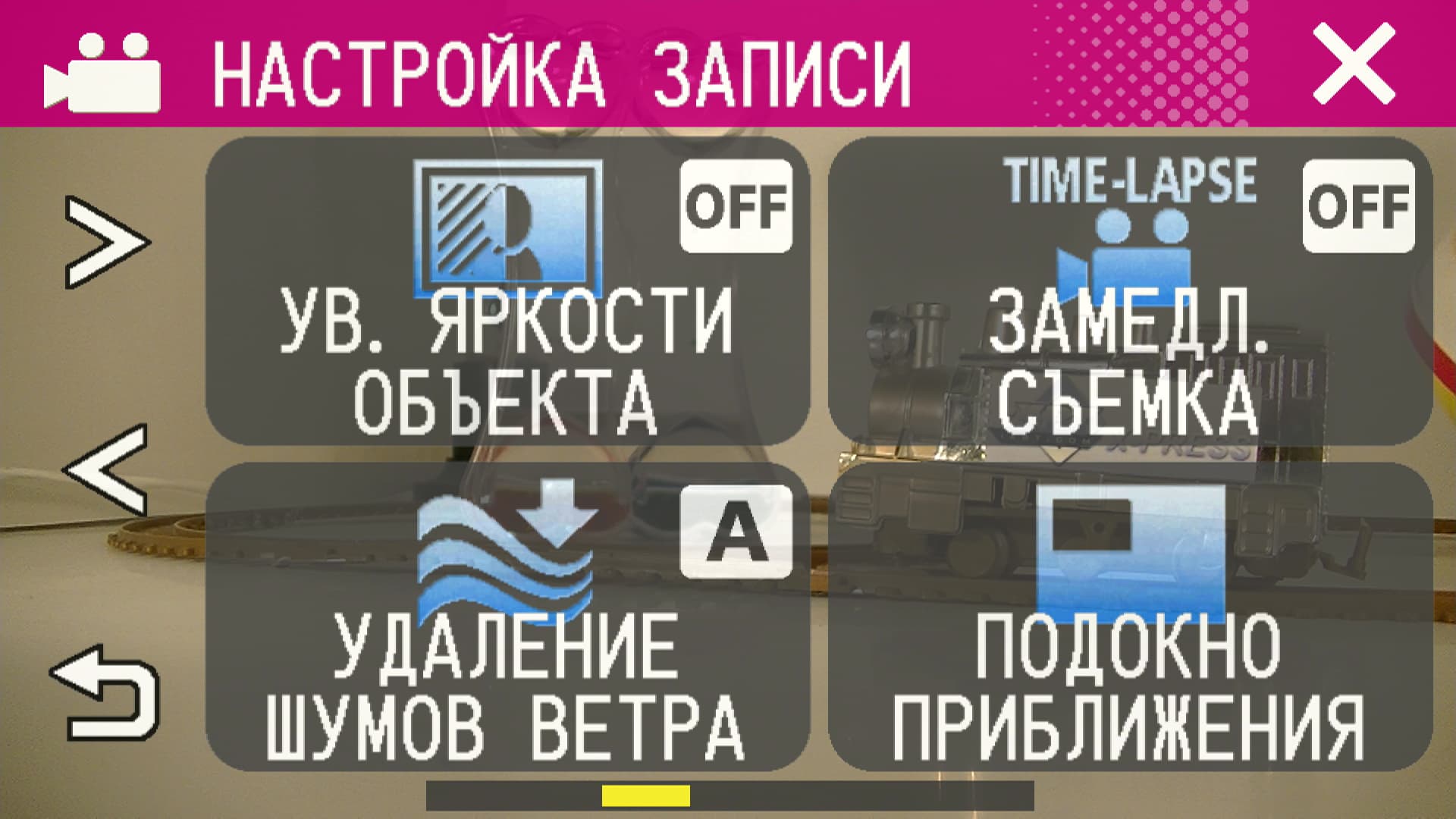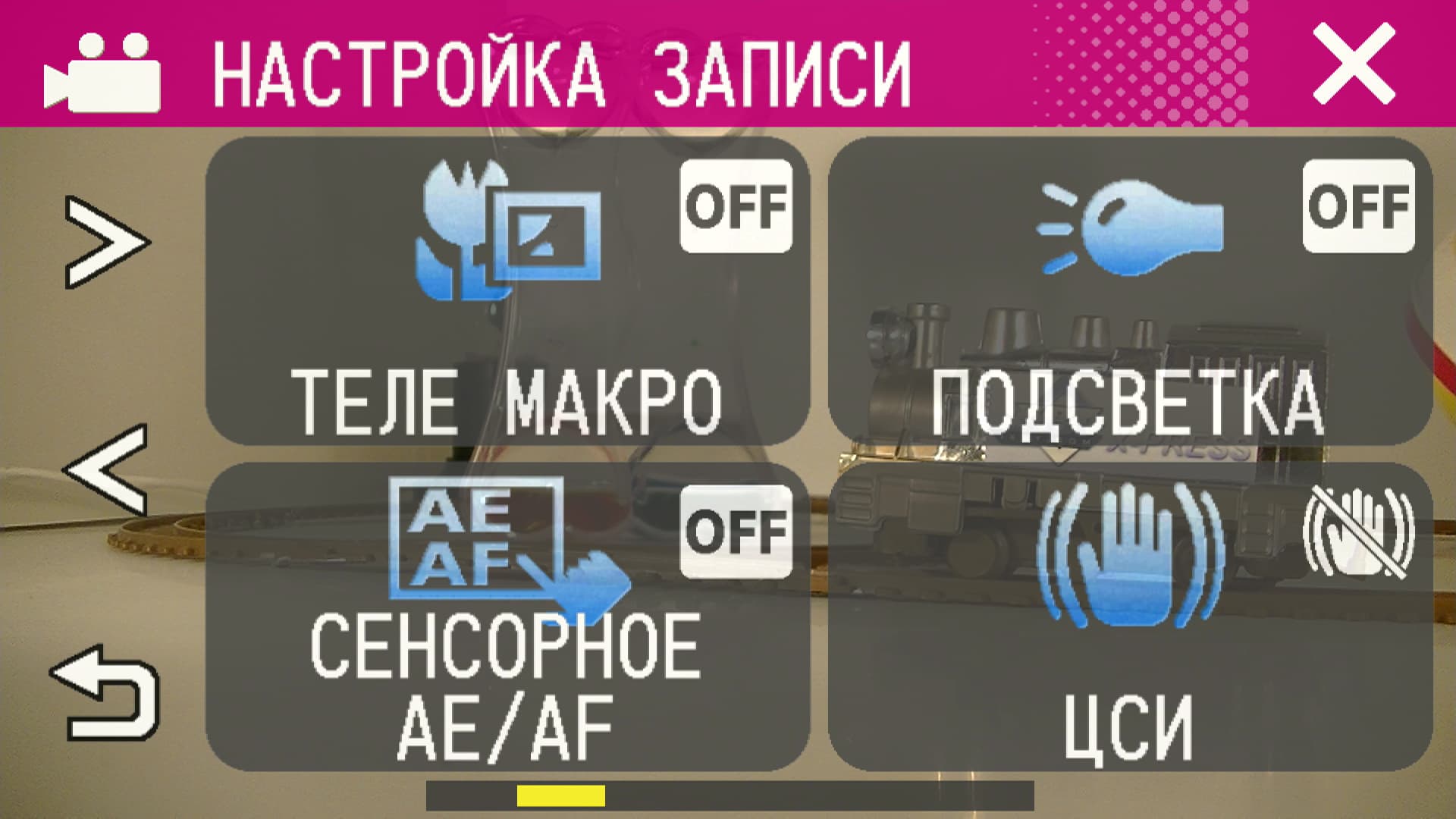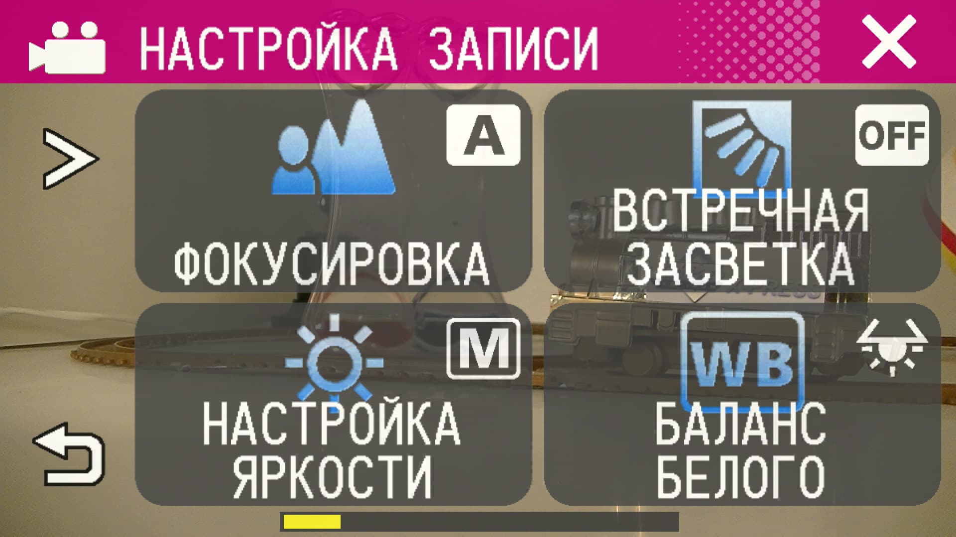 Когда камера переведена в режим ручных настроек, то параметры записи состоят из семи страниц. Это очень немало для любительской видеокамеры начального уровня.