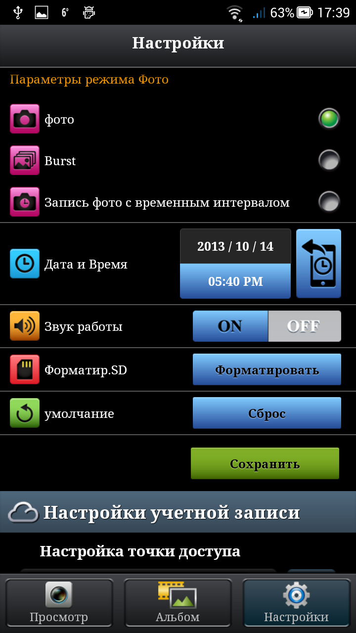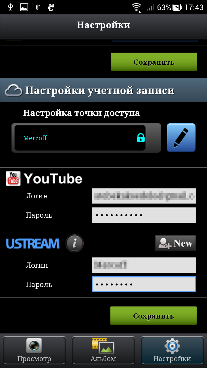 Камера умеет самостоятельно вести трансляцию в интернет (для этого используется известный ресурс Ustream) или заливать видеоролики на YouTube. Здесь же, в разделе Альбом, можно просмотреть записанные видеоролики или фотографии, имеющиеся на карте памяти камеры.