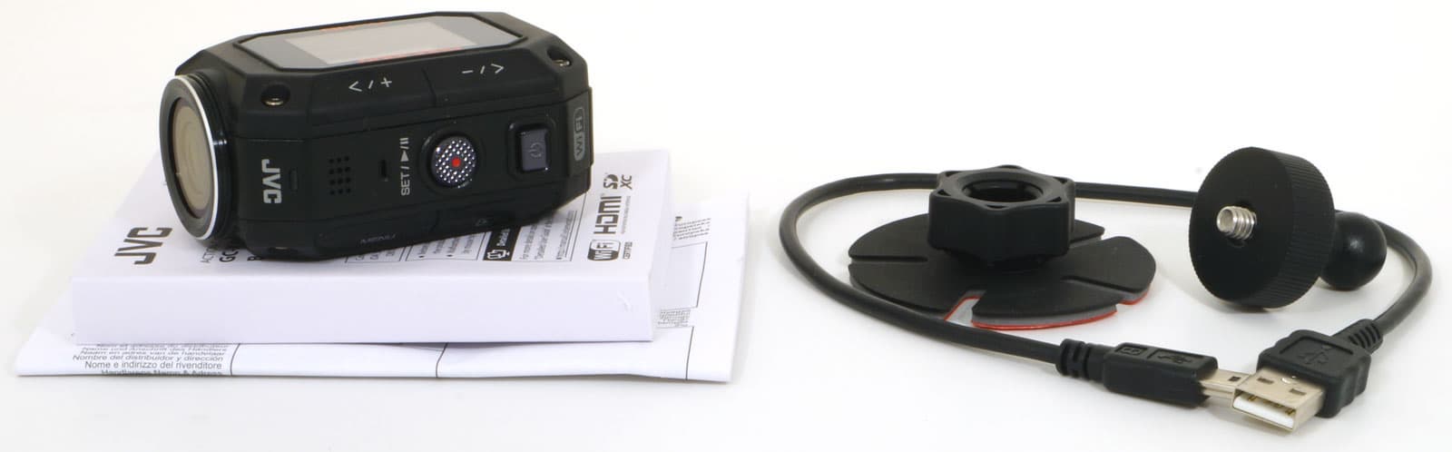 Количество аксессуаров, прилагаемых к камере, серьезно уменьшилось по сравнению с комплектностью JVC GC-XA1. Здесь имеется лишь короткий кабель USB—Mini-USB, да универсальное крепление на липкой подошве.
