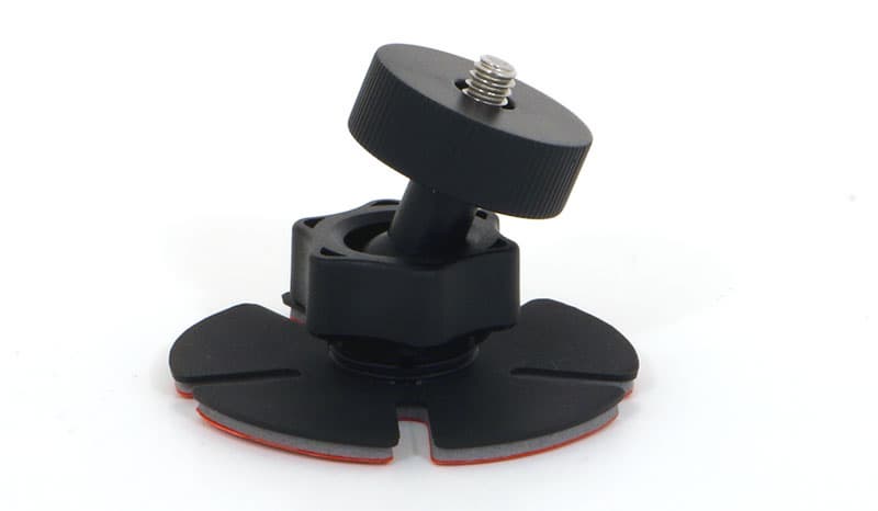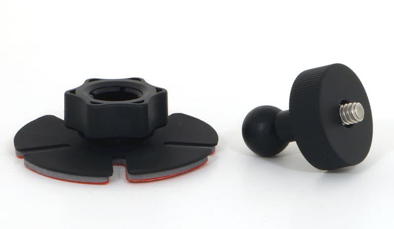 Несколько слов о единственном прилагаемом креплении: оно состоит из двух деталей, основания и шарикового держателя. Последний вставляется в основание и фиксируется пластмассовой гайкой. Резьбовое крепление держателя соответствует распространенному стандарту штативной резьбы — 1/4 дюйма. Кстати, лепестки у основания — гибкие. Это сделано для того, чтобы его можно было прикрепить к изогнутой поверхности.