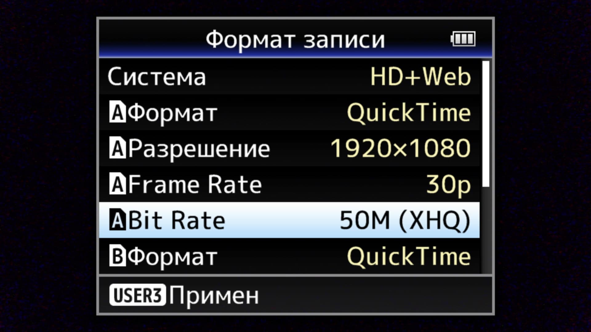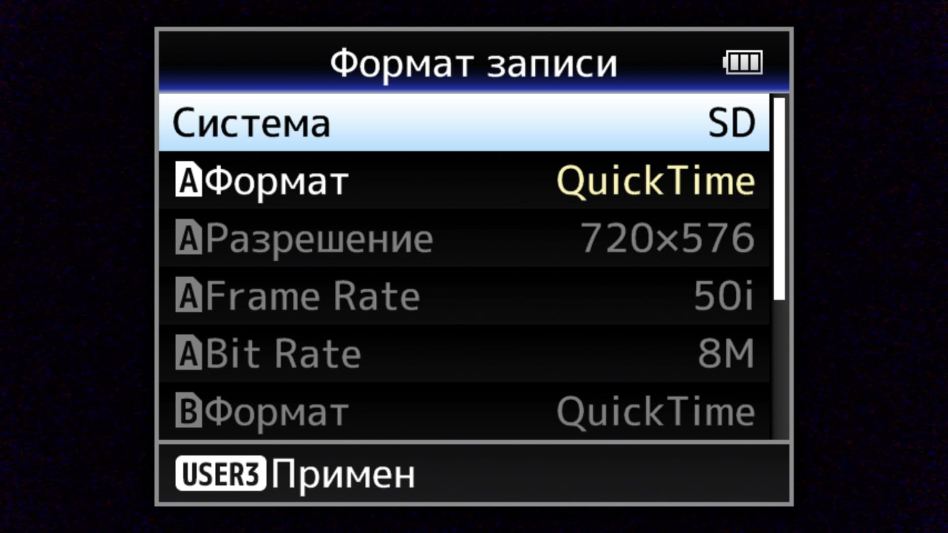 Рассматриваемая видеокамера записывает видео в стандартный кодек AVC (H.264), но упаковка может производиться в два разных контейнера: QuickTime (.MOV) и AVCHD (.MTS/M2TS). Выбор разрешений, частот кадров и битрейтов позволит