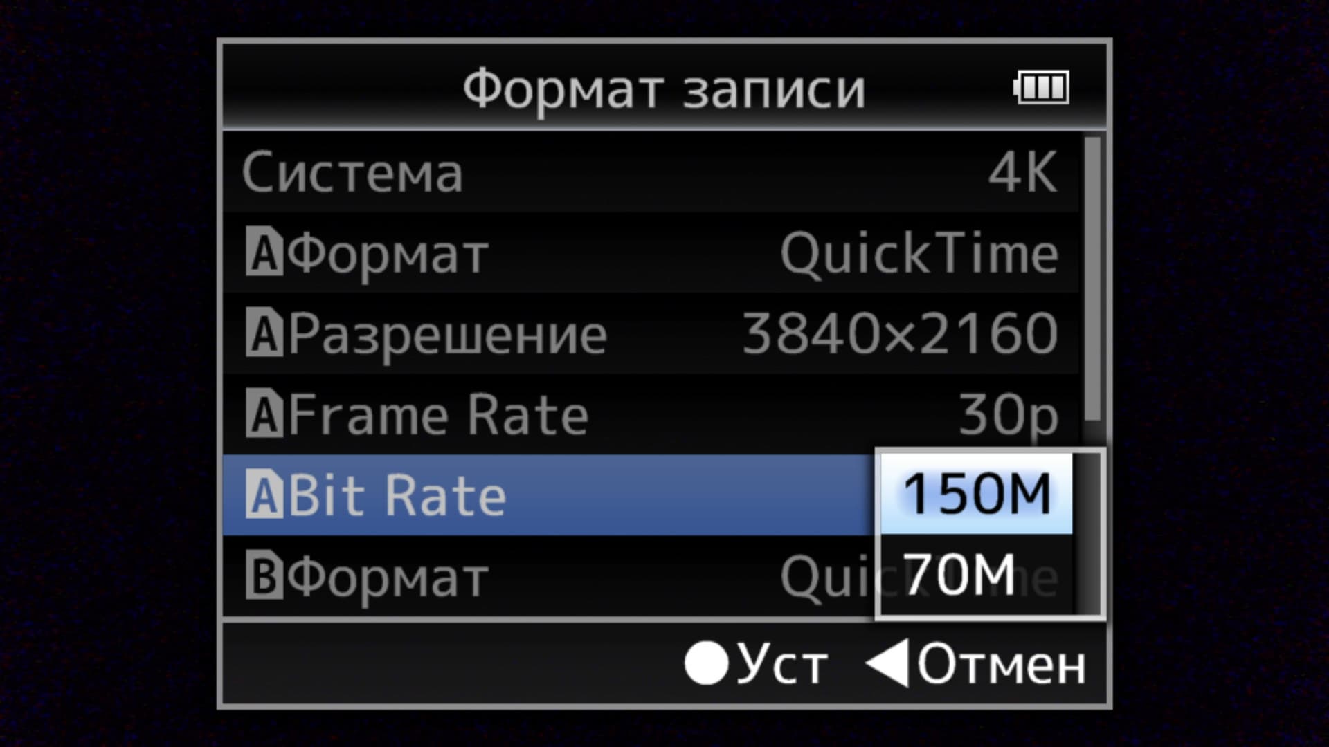| 4K 30p 150 Мбит/с | 4K 30p 70 Мбит/с |