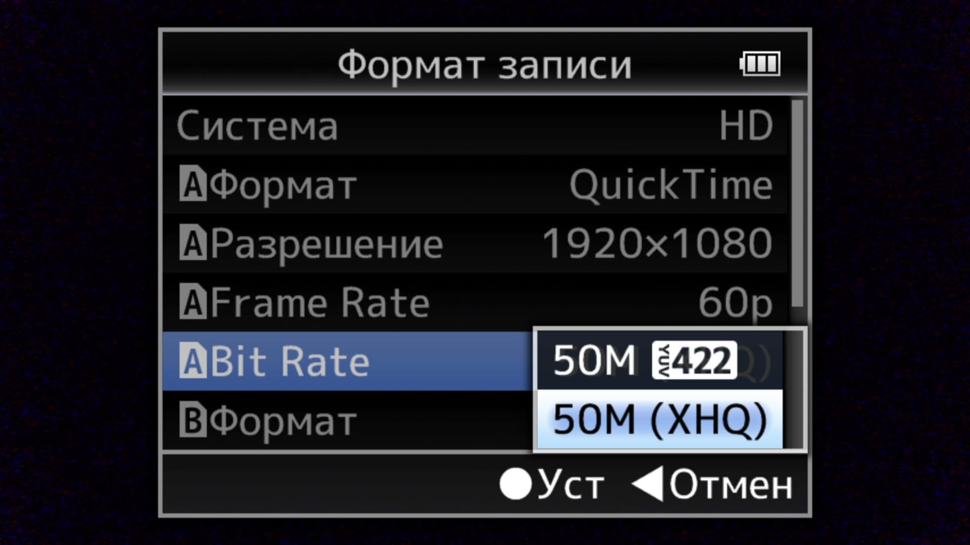 | 1920×1080 60p 50 Мбит/с 4:2:0 | 1920×1080 60p 50 Мбит/с 4:2:2 |