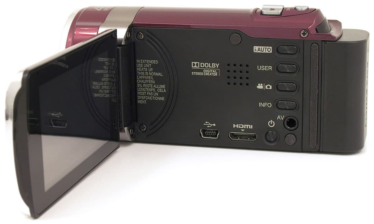 ЖК-экран имеет размер 2,7″ (небольшой по нынешним меркам), никаких дополнительных механических и иных органов управления на экране не предусмотрено — сплошное стекло, лишённое рамки (а вот это очень удобно — негде скапливаться пыли). Видеокамера ведёт запись только с открытым ЖК-экраном — стоит его закрыть, камера выключается. Под ЖК-экраном находится встроенный динамик, порты USB и HDMI, а также композитный аудио/видеовыход. Сверху вниз расположены кнопки управления: