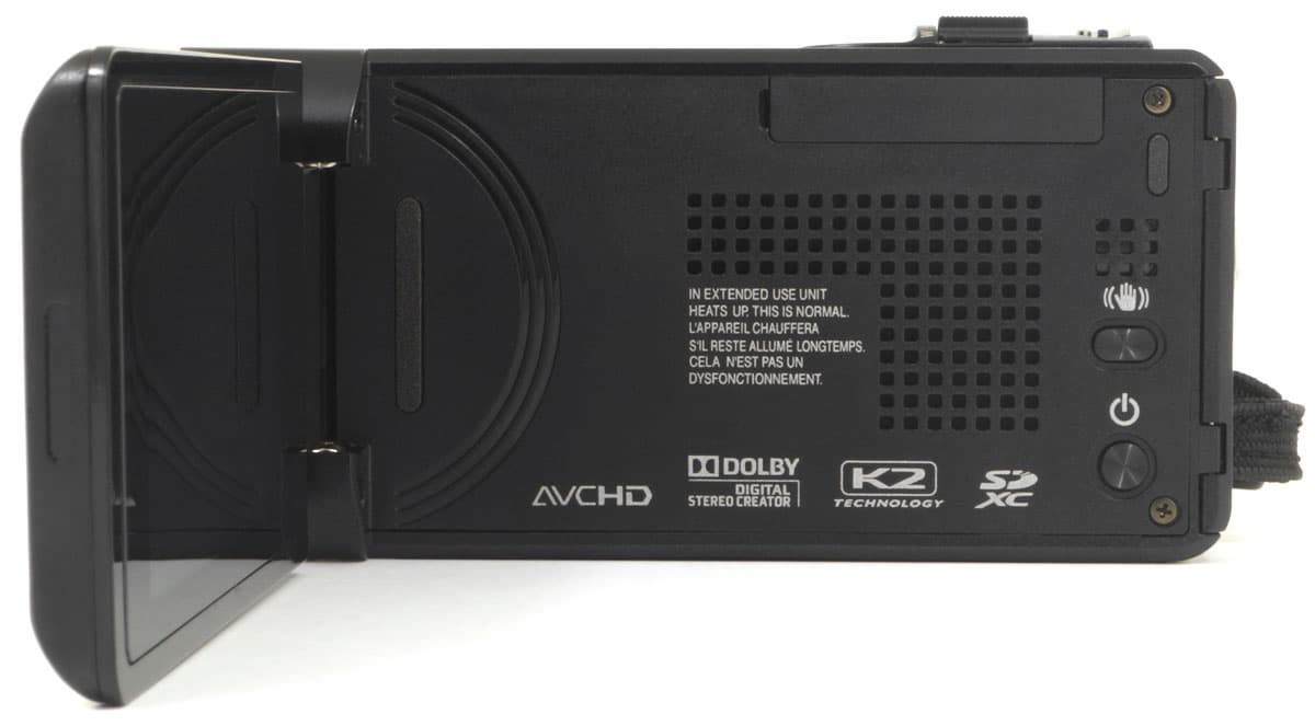 Под откидным ЖК-экраном имеется множество вентиляционных отверстий, помогающих отводу тепла от электроники камеры; здесь же находится решетка встроенного динамика-пищалки, кнопка смены режимов стабилизатора и кнопка включения/отключения питания камеры.