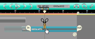 Обрезка клипов производится как по отдельности, так и непосредственно на таймлинии. Для этого служат специальные метки, возникающие по краям выделенного клипа. Здесь же существует возможность и разделить клип на несколько частей, просто щёлкнув интерактивными ножницами на таймлинии.