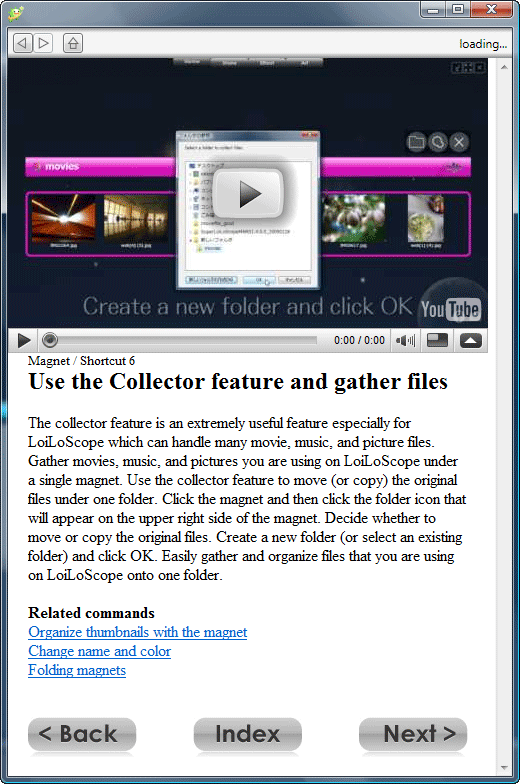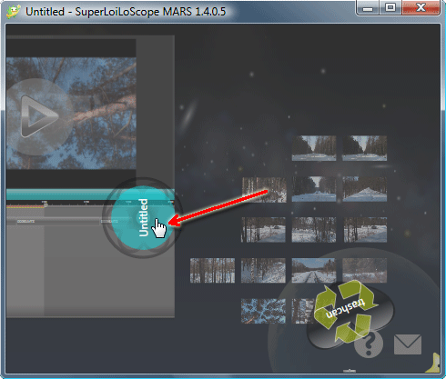 После этого программе понадобится некоторое время, чтобы проиндексировать каждый файл и отобразить миниатюры кадров. Миниатюры эти располагаются в том месте программного пространства, в которое вы их "бросили". По большому счёту, в LoiLoScope отсутствует ограничение такого пространства, окно программы можно растянуть хоть на несколько мониторов, а программные элементы, иконки файлов, корзину можно поместить в любое место этой площади, при этом они никоим образом не закрепляются и не имеют постоянного жестко зафиксированного положения.