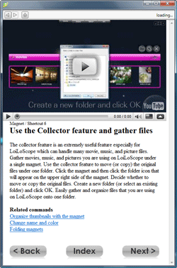 Справочная система, вызываемая клавишей F1 либо нажатием пиктограммы с вопросительным знаком, полностью сетевая то есть, вся отображаемая информация скачивается из Интернета, с сервера программы. Здесь даже присутствуют короткие видеоуроки, для их проигрывания в справочной системе используется плеер YouTube.