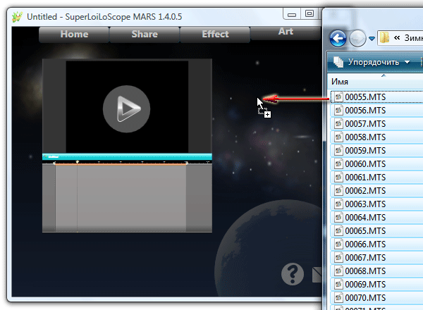 Итак, первое, что требуется это импортировать в программу материал, подлежащий обработке. Видеоклипы, фотографии, звуковые файлы... Здесь отсутствует модуль импорта или захвата готовые к обработке файлы попросту перетаскиваются мышью из проводника в окно LoiLoScope.