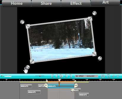 Рассмотрим, какими инструментами располагает эта таймлиния. Двойной щелчок по одному из клипов приводит его в боевую готовность: в окне просмотра клип обрамляется редактируемой рамкой, позволяющей изменить размеры кадра или повернуть его на произвольный угол.