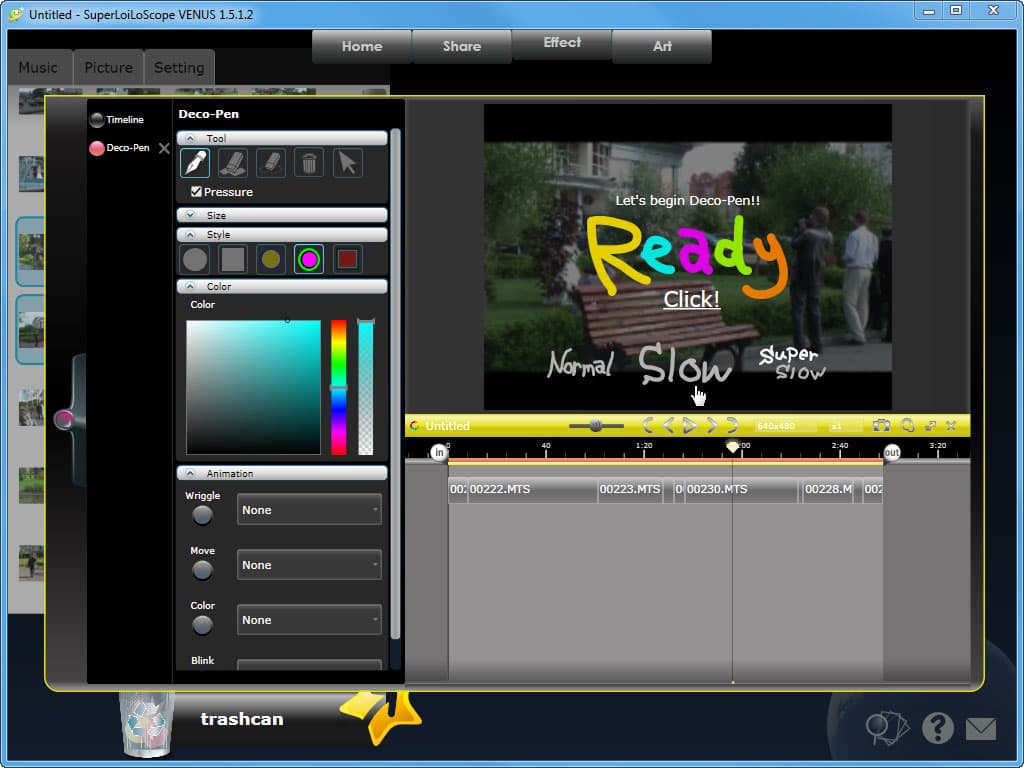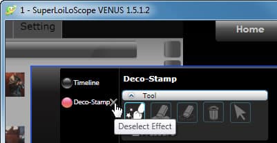 На рисунке — Deco-Stamp в состоянии готовности. Пользователь должен выбрать форму, цвет, размер кисти, или объект, которым будет производиться это рисование, а также скорость проигрывания клипа: нормальную (100%), медленную (50%) или супер-медленную (25%). Не у всех мгновенная реакция, поэтому желательно рисовать поверх видео, проигрывающегося хотя бы со скоростью 50%.![]()