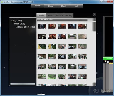После того, как нужный каталог выбран, программа быстренько просканирует его и отобразит миниатюры файлов во вкладке Video. Если в этой же папке имеются другие типы мультимедиа — фото или музыка — они тоже отобразятся в соответствующих вкладках: Music и Picture.