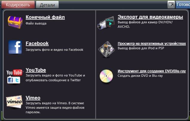 Экспорт готового проекта из программы теперь возможен во множество форматов, все эти пункты собраны в отдельной вкладке Кодировать. В большей степени здесь интересны такие пункты, как Конечный файл, Экспорт для видеокамеры и Инструмент для создания DVD/Blu-ray.