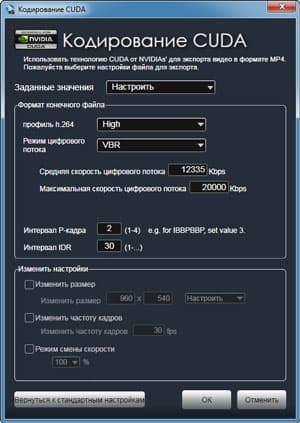 Рассмотрим часть этих пунктов. Экспорт в конечный файл возможен в нескольких вариантах: видео различных форматов и звук (WAV, AAC, WMA). Следует заметить — при наличии видеокарты NVIDIA, поддерживающей архитектуру CUDA, данный список пополняется ещё одним пунктом, который так и называется — MP4 (CUDA).