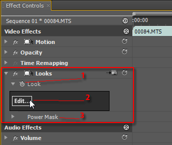 После присвоения эффекта какому-либо клипу, его настройки появятся в панели Effect Controls. Присутствующая здесь пиктограмма часов (1) говорит о том, что действие данного эффекта позволено произвольно ограничивать во времени. Кнопка Edit (2) запускает графическую оболочку плагина, а параметр Power Mask задаёт маску, ограничивающую площадь действия эффекта в кадре.
