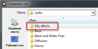 Однако имейте в виду: чтобы впоследствии ваш самодельный эффект появился в общей копилке, вы должны сохранить его либо в одну из существующих папок с этими самыми look-ами, либо (что гораздо удобнее) создать свою папку, куда впоследствии и "складывать" свои творения.