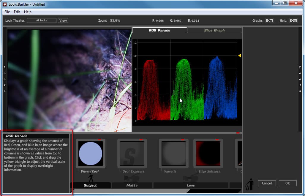 Эти окна играют чисто информативную роль. Первое состоит из двух вкладок, RGB Parade и Slice Graph, в которых отображается цветовое пространство текущего кадра в виде соответствующих графиков.