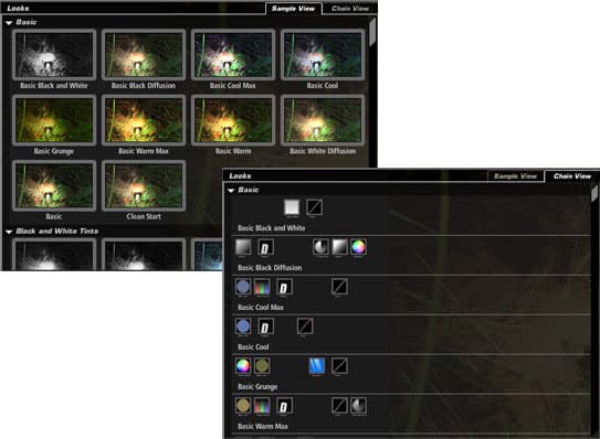 Данная панель состоит из двух вкладок: Sample View и Chain View. Первая содержит, как уже сказано, миниатюры видеокадра, обработанные тем или иным эффектом. А вторая вкладка — Chain View — раскрывает состав данного эффекта в виде цепочки фильтров, из которых этот эффект состоит.