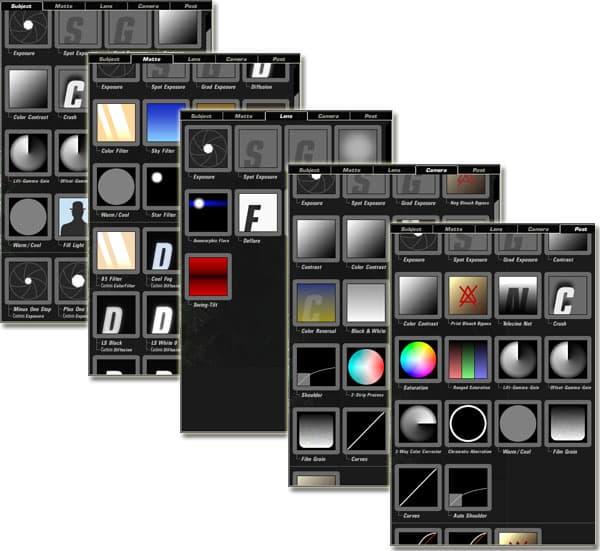 Обратимся к правой панели, также выплывающей при наведении курсора мыши к краю программного окна. Эта панель состоит уже из пяти вкладок: Subject, Matte, Lens, Camera и Post.
