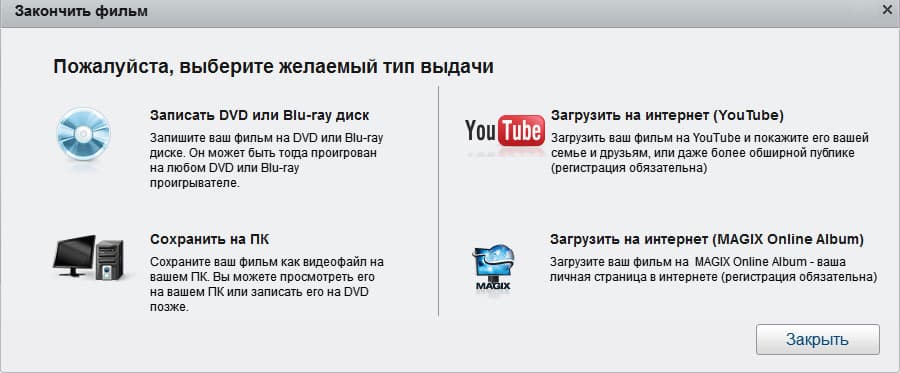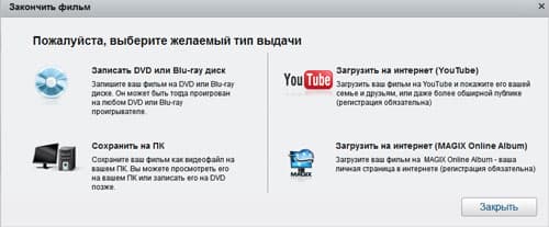 Вот теперь пора приступать к экспорту. Для этого следует нажать кнопку, имеющую вполне очевидное название: Закончить фильм. В появившемся окне имеется возможность выбрать способ экспорта. Немалая часть пользователей наверняка предпочтёт отказаться от локальных и тем более физических носителей, выбрав YouTube или фирменный Magix Online Album. Однако мы испробуем также и два первых варианта сохранения видео: запись диска и сохранение на ПК.