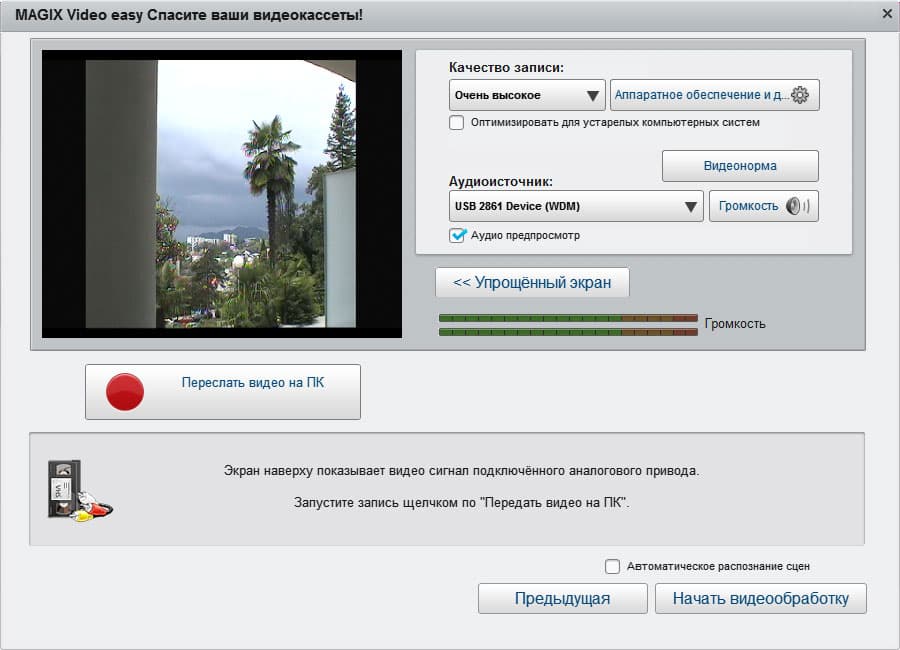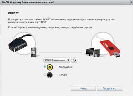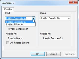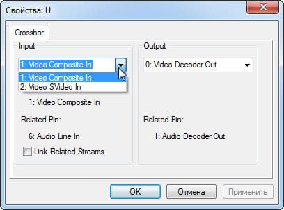 Здесь мы столкнёмся с очередным выбором: нужно определиться с источником. Это очень просто: в зависимости от того, каким кабелем подключен видеомагнитофон, такой источник и следует выбрать. Чаще всего захват просмотр видео с видеомагнитофонов производится через композитное подключение — знакомые разноцветные тюльпаны. Таким же образом и следует подключать видеомагнитофон к USB-адаптеру.