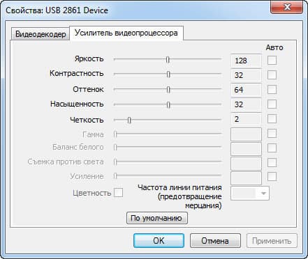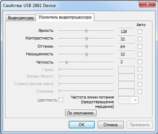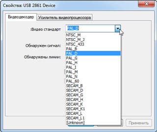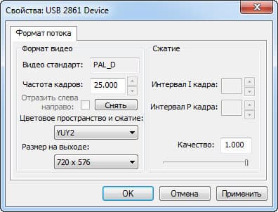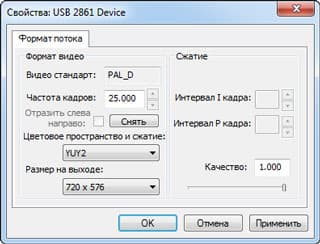 Кнопка Аппаратное обеспечение… открывает доступ к более тонким настройкам захвата видеосигнала, а именно: выбору источника (композитный, S-Video), свойствам видеодекодера (выбор телевизионной системы, настройка яркости, контрастности и прочих параметров картинки) и, наконец, формату потока. Здесь разрешается выбрать одно из имеющихся значений размера кадра — требуется проследить, чтобы он составлял 720×576, если захват ведётся в системе PAL/SECAM. Частоту кадров при этом обычно изменять не требуется: для системы PAL она по умолчанию составляет «правильные» 25 кадров в секунду.