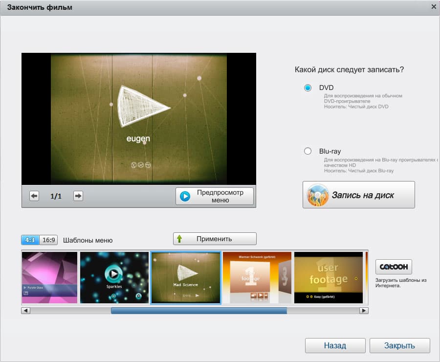 В первом случае потребуется наличие привода и соответствующего пустого записываемого оптического диска. При создании такого фильма программа автоматически генерирует меню диска, в котором присутствует главная страница и несколько второстепенных, содержащих ссылки на каждую сцену фильма.