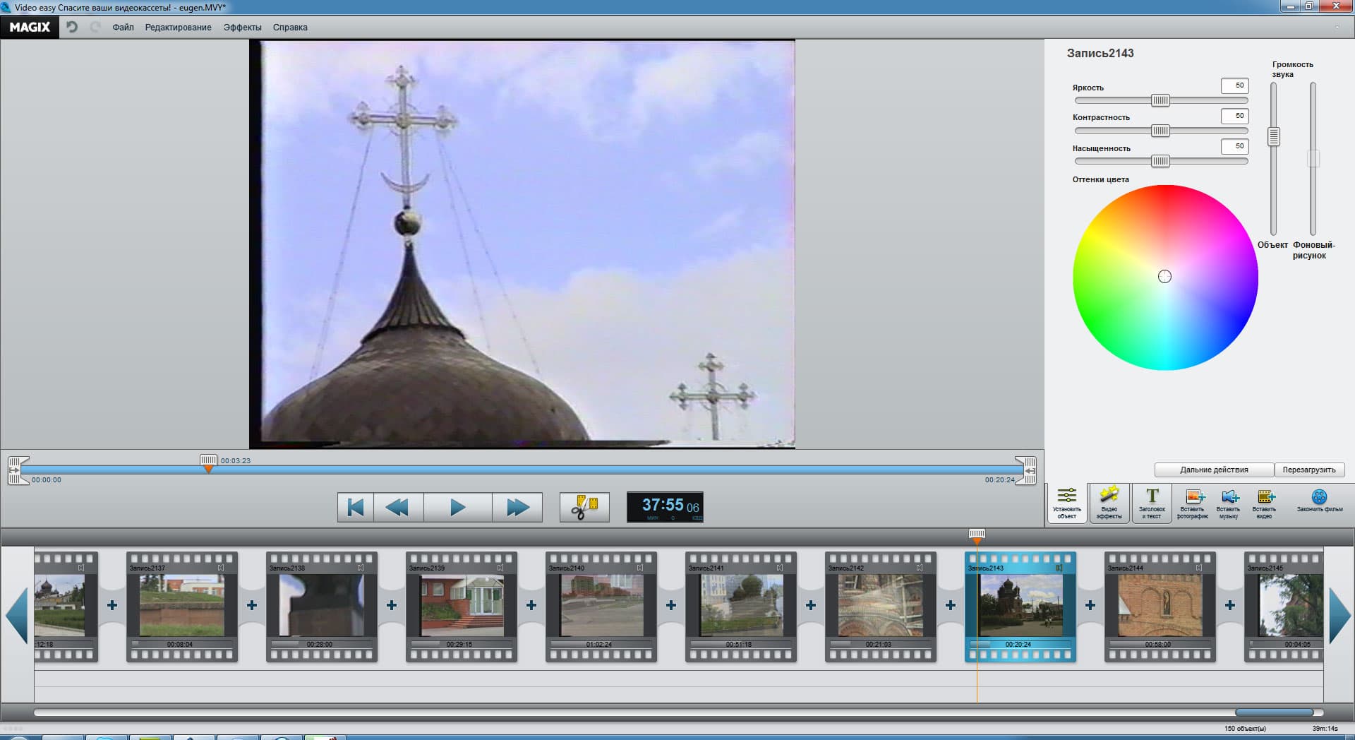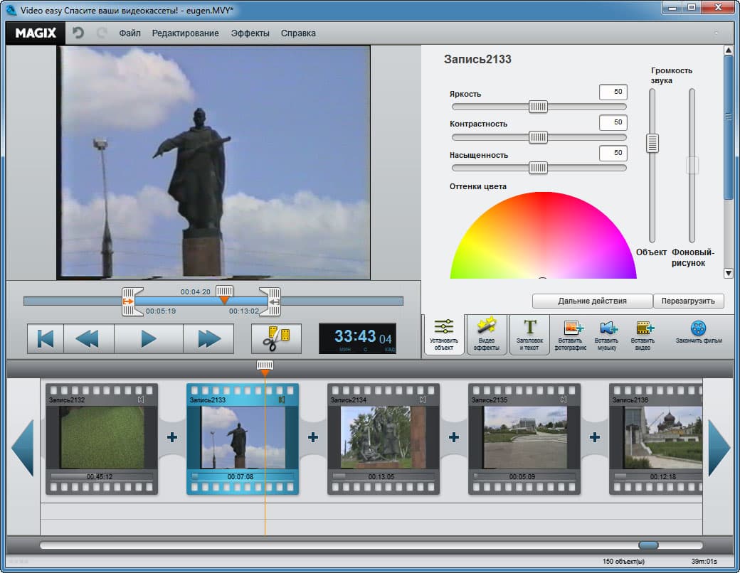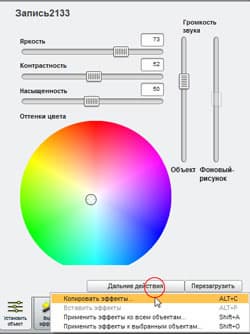 Гораздо больше пользы принесут другие «эффекты» — те, которые не видны. Как ни странно это звучит. В число таких эффектов входит, в первую очередь, цветокоррекция. Быстрое приведение картинки в норму производится в инструментальном окне на первой его вкладке. Более того, настроив яркость видео, его оттенок и насыщенность, пользователь имеет возможность запомнить созданный эффект и применить его ко всем сценам в фильме.