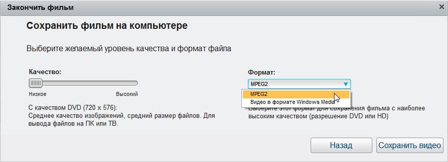 Если же пользователь выберет опцию сохранения фильма на жёсткий диск ПК, то в его распоряжении окажется лишь два формата, в которые программа кодирует проект. Это MPEG-2 и Windows Media. Качество видео регулируется ползунком, находящимся в левой части панели.