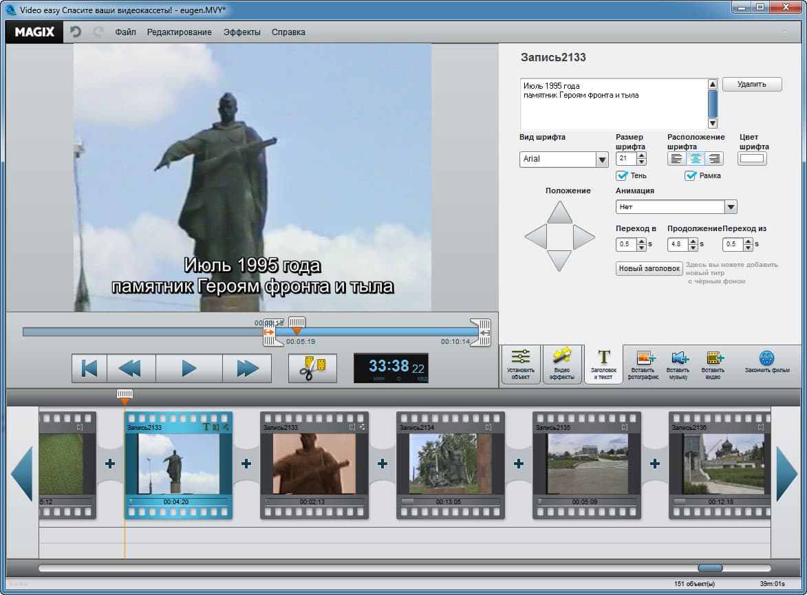 Следующий неотъемлемый приём любого фильма — конечно, титры. Они вводятся и настраиваются в соответствующей вкладке окна инструментов. Здесь имеется достаточное количество параметров, регулирующих как внешний вид текста, так и его поведение, включая анимацию. Следует помнить — впоследствии эти титры будут «вшиты», наложены поверх фильма. Их уже не сотрёшь и не исправишь без полной переделки всего проекта, поэтому при вводе текста требуется быть крайне внимательным. Особенно тем, кто не находится в тесной дружбе с грамматикой и орфографией.