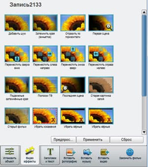 К различным видеоэффектам нужно подходить с не меньшей осторожностью, чем к видеопереходам. Использовать желательно лишь те, которые уместны в данном конкретном случае. Этих эффектов в копилке программы не так уж и много — возможно, это и к лучшему. В отличие от переходов, эффекты присваиваются клипам (сценам) путём перетаскивания нужной иконки на клип, находящийся на таймлинии.
