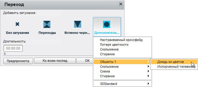 Пространство между сценами оформлено в виде пустых промежутков, ожидающих вставки определённого перехода. Вставить тот или иной переход можно, нажав иконку с плюсом и выбрав один из нужных.
