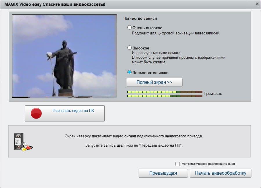 Если пользователь желает, чтобы по окончании захвата программа автоматически разбила захваченное видео на виртуальные отрезки, или сцены, — можно отметить соответствующий пункт флажком. Однако делать это следует лишь в тех случаях, когда ваше видео не очень разнородно по содержанию, и уровень звука в нём не «пляшет» вверх-вниз. В противном случае вы рискуете получить сотни сцен, каждая из которых имеет длительность в несколько секунд. Так или иначе, но, как показывает практика работы с любительским видео, гораздо надёжнее определять сцены (производить монтаж) самостоятельно, вручную проматывая в программе монтажа видео от начала и до конца.