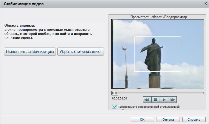Второй действительно нужный и «невидимый» зрителю эффект — это стабилизация картинки. «Древние» видеокамеры, как правило, не имели встроенного стабилизатора. Если таковой и присутствовал, то в относительно современных моделях видеокамер, да и то лишь электронный. Поэтому нельзя не использовать такой полезный инструмент, имеющийся в программе. Вызов модуля стабилизации осуществляется через меню, всплывающее по нажатию правой кнопкой мыши на клипе (сцене).