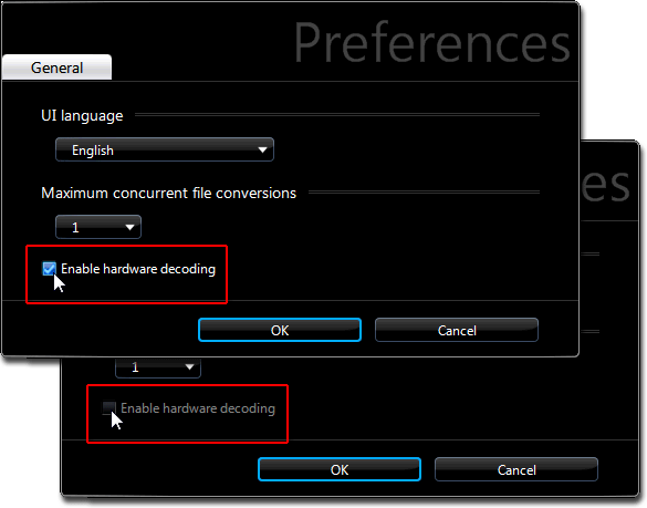 О последнем пункте нужно сказать подробнее: как удалось выяснить, данный параметр не увеличивает скорость кодирования (даже, наоборот, в некоторых случаях кодирование производится дольше на едва заметное время, исчисляемое в единицах процентов). Суть технологии в другом: активация аппаратного декодирования разгружает процессор, уменьшая нагрузку во время кодирования — следовательно, пользователь может заниматься чем-либо ещё в то время, пока компьютер занят работой. К сожалению, эта опция доступна только при наличии видеокарты AMD, а в случае, если вы работаете с видеокартой NVIDIA, то данный пункт неактивен.