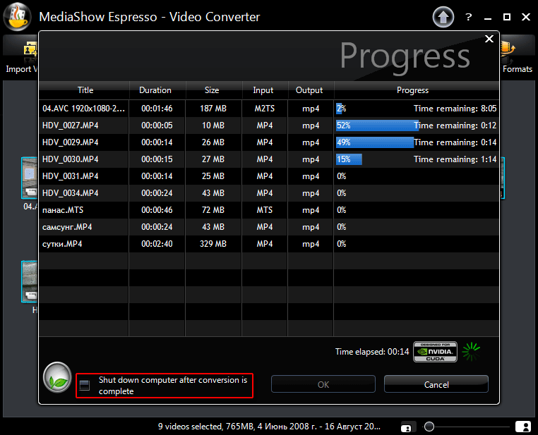 Прогресс кодирования отображается в специальном окне, где имеется возможность задействовать автоматическое выключение компьютера по окончанию кодирования. На рисунке производится кодирование в четыре потока одновременно — это значительно уменьшает время работы, но лишь в тех случаях, когда обрабатывается "лёгкий" материал и кодирование производится в нересурсоёмкие форматы, не загружающие процессор на 100% (центральный процессор всегда участвует в кодировании, даже если оно производится силами графического процессора. Ведь CPU всегда отвечает за распаковку, изменение размера кадров и их передачу в графический процессор для упаковки).