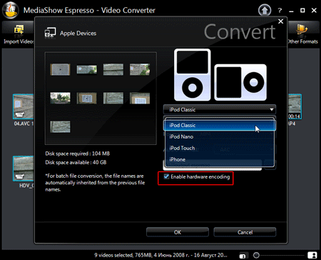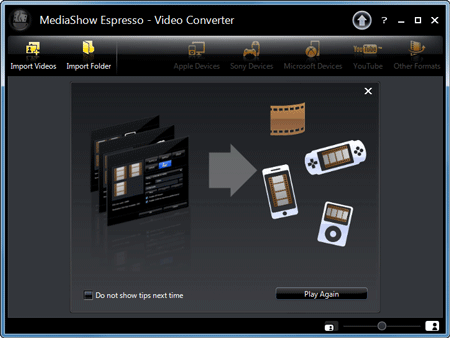 CyberLink MediaShow Espresso предназначен, как нетрудно догадаться, для перекодирования видеоматериала из одного формата в другой. Программа ориентирована, в первую очередь, на владельцев мобильных устройств, умеющих проигрывать видео — по крайней мере, разработчик позиционирует своё ПО именно таким образом.