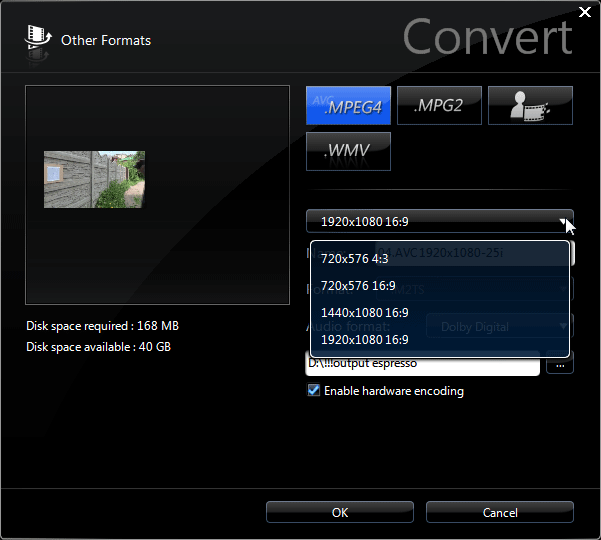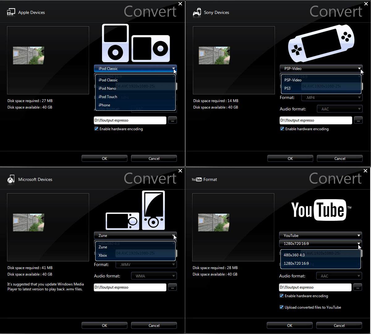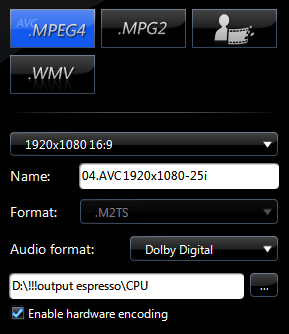 Данные файлы последовательно кодировались в различные форматы со следующими пресетами (предустановками) CyberLink MediaShow Espresso: